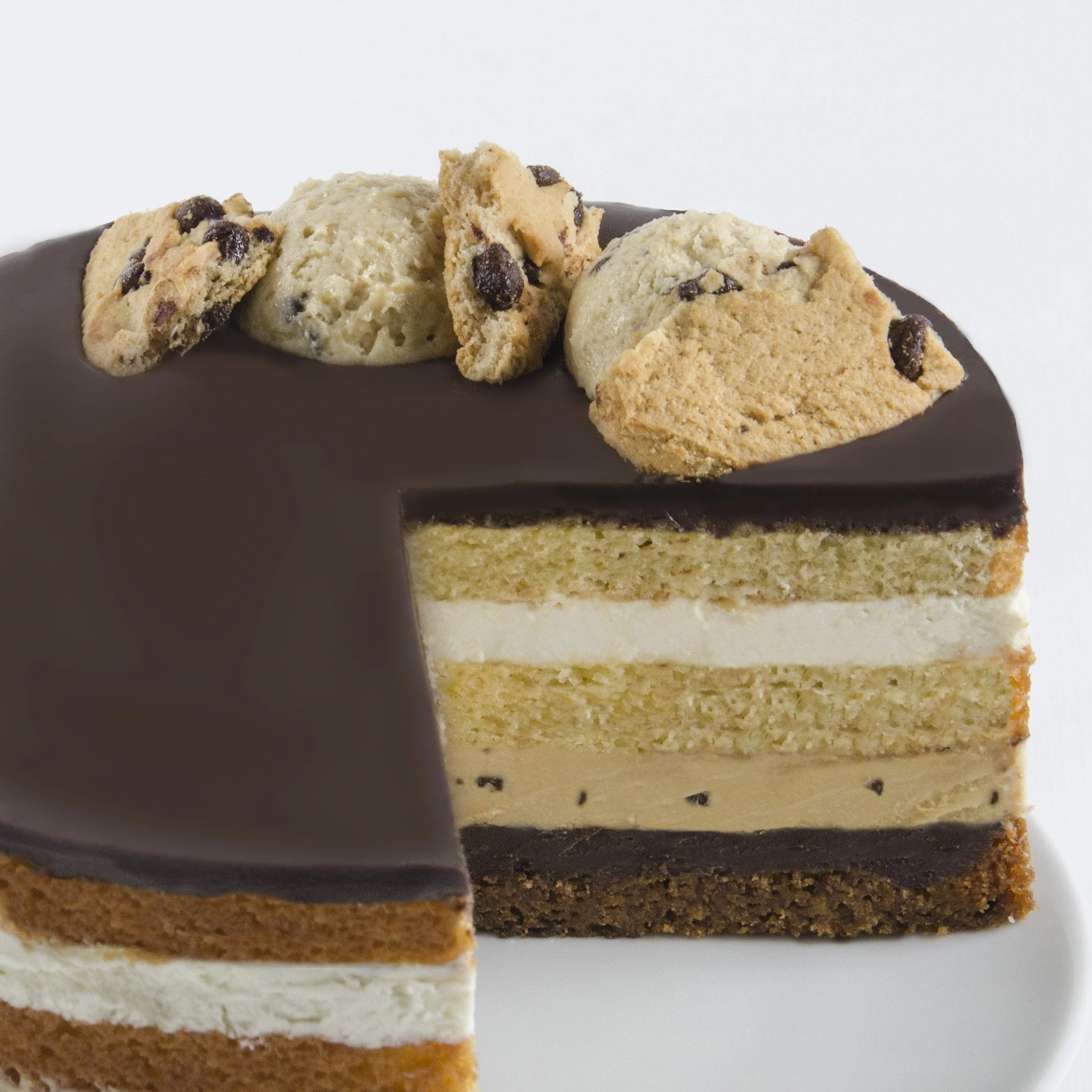 Seven layers of the ultimate cookie dough experience! A chocolate chip cookie base is layered with cookie dough frosting, vanilla cake, vanilla mousse and chocolate fudge.