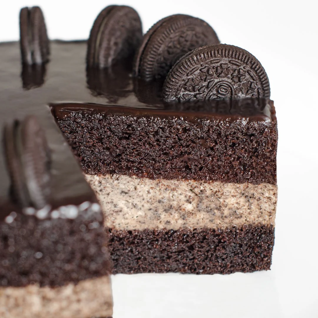 Smooth cheesecake mousse, blended with cookie pieces, sandwiched between two layers of rich chocolate cake. Finished with a dark chocolate glaze and Oreo® cookies.